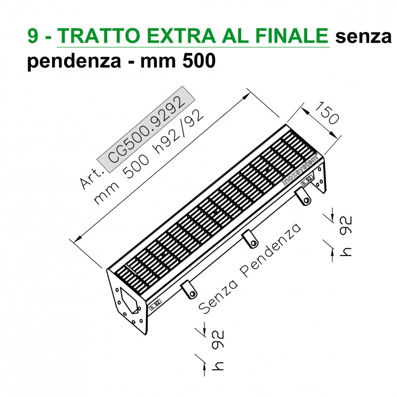 Canale a griglia in acciaio inox - TRATTO EXTRA senza pendenza - L mm 500, H mm 92 costante. Possono essere assemblati in aggiunta al tratto finale.